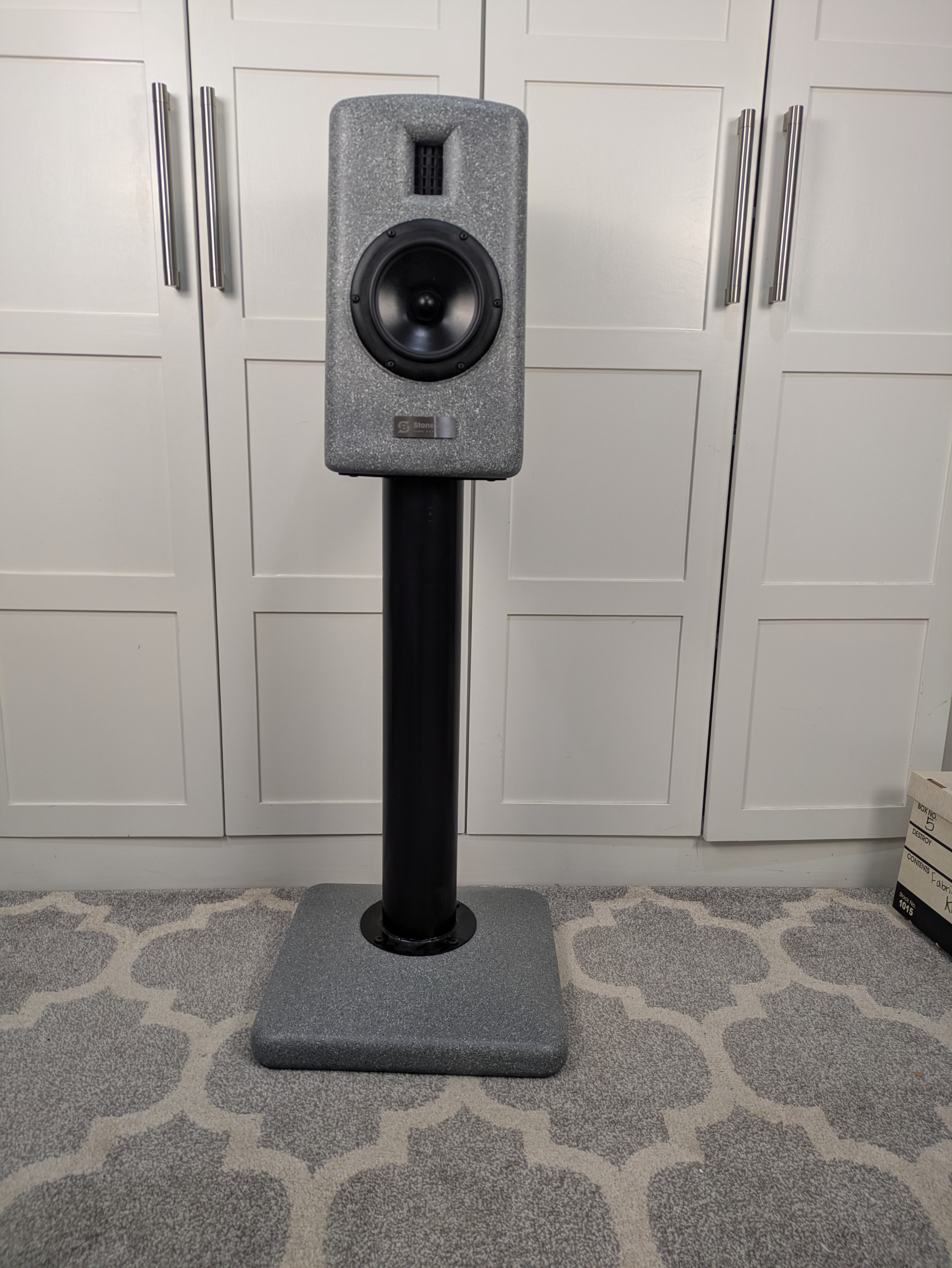 The Arcus Foundation is a purpose-built stand pair, cast from the same StoneCast composite as the speaker it carries and finished to match. Each base weighs 65 pounds. A powder-coated steel column locates the Arcus through M6 threaded inserts cast directly into the cabinet, bolting the speaker down rather than setting it on top. Assembled, each side weighs 115 pounds — heavy enough to stay exactly where you put it.